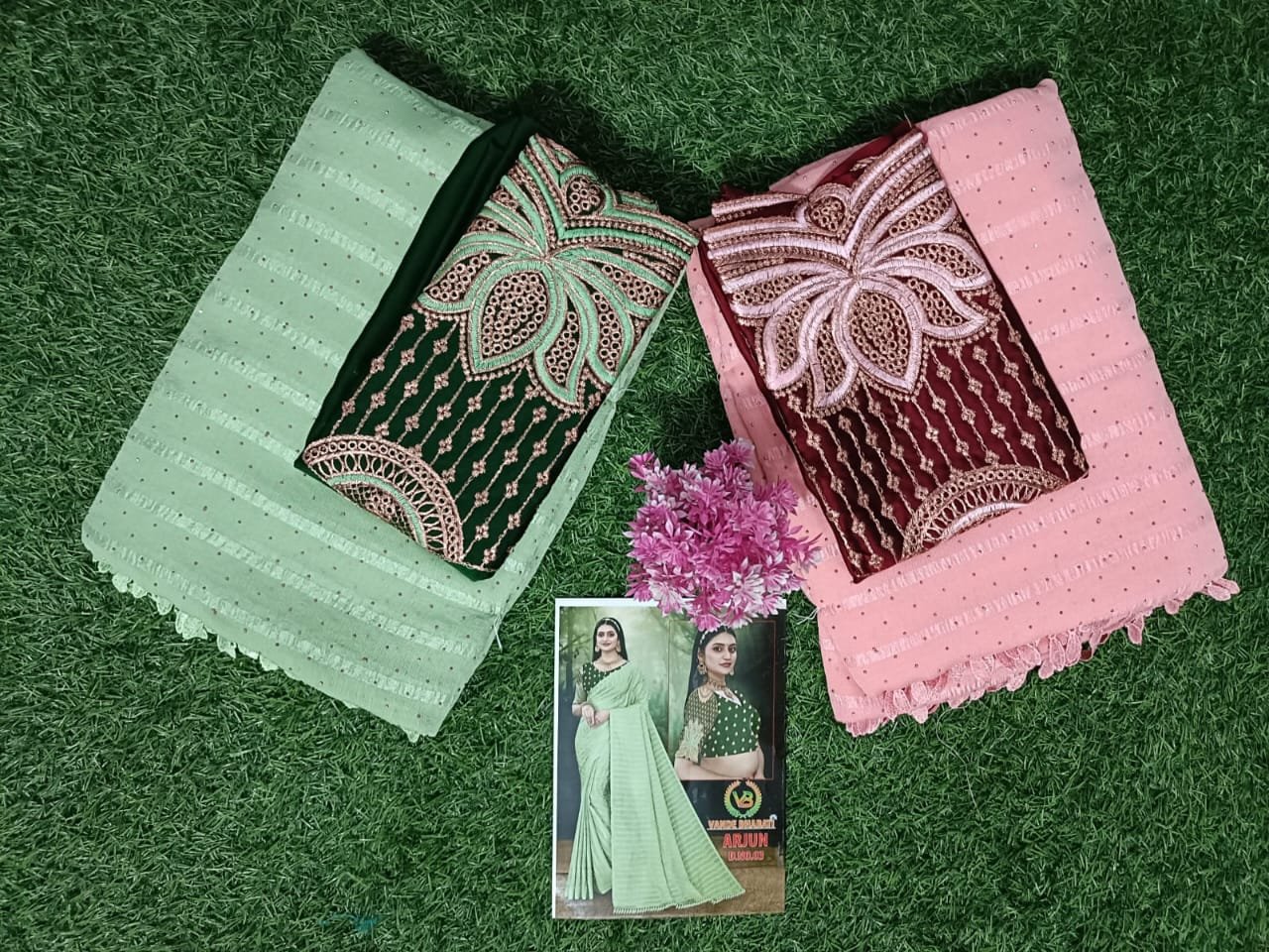 Turn heads with our Graceful Designer Partywear Saree, crafted to make every moment special. This collection features two soothing pastel shades—mint green and blush pink—enhanced with intricate self-textured detailing and paired with stunningly embroidered contrast blouses in deep green and maroon. The rich thread and sequence work on the blouse adds a glamorous touch, making this saree ideal for festivals, parties, and special functions.
